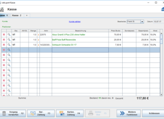 Besondere Stärken der velo.port-Faktura sind die leistungsstarke Freitextsuche und der unmittelbare Überblick über Deine Lagerbestände direkt im Fakturavorgang. Die Farbkennzeichnung zeigt Dir die Verfügbarkeit des gewählten Artikels an.